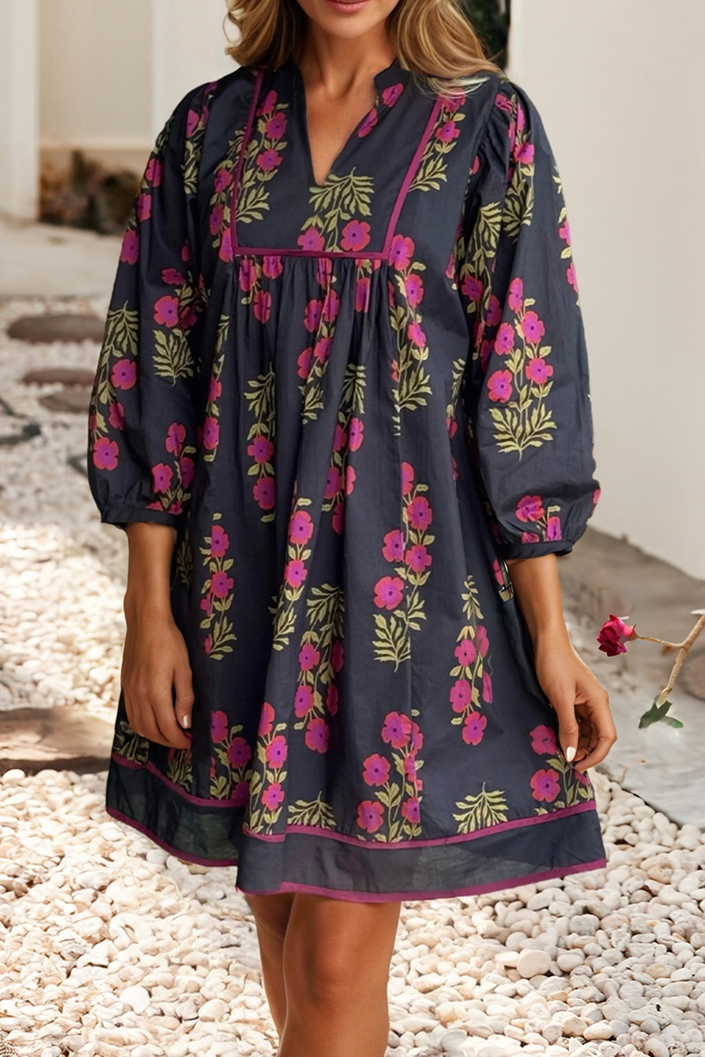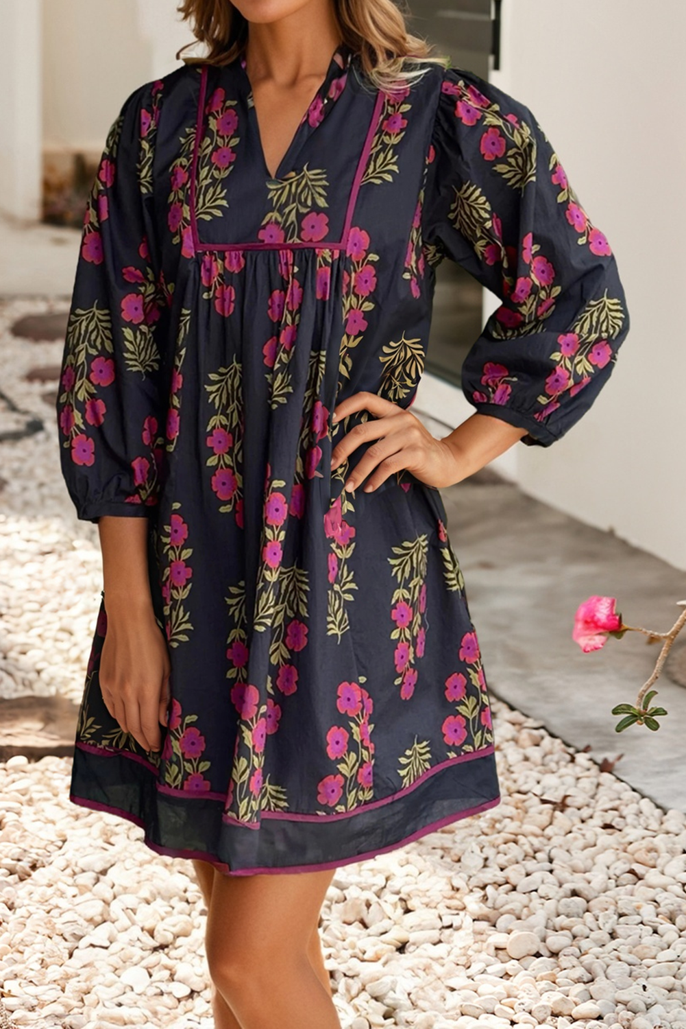Notched Neck Piping Trim Bracelet Sleeve Babydoll Dress Material 100%Cotton Style Casual Pattern Floral Occasion Daily Season S/S 🌸 Floral mini dress brings effortless feminine charm. 🌬️ Relaxed silhouette keeps you cool and breezy. 💖 Sweet details ensure adorable style all day. 👗 V-neck, square yoke, and bracelet sleeves add flair.